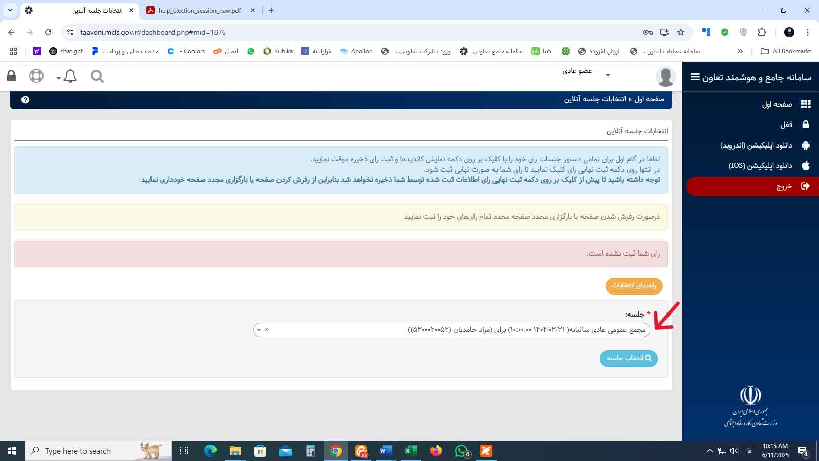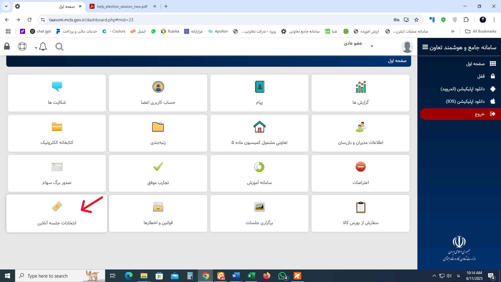 مرحله سوم: جهت ورود به جلسه بر روی دکمه انتخابات جلسه آنلاین کلیک نمائید.